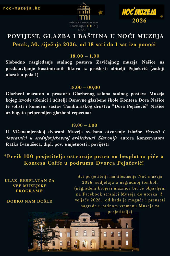 Zavičajni muzej Našice sutra, 30. siječnja 2026. godine, sudjeluje u 21. izdanju nacionalne manifestacije Noć muzeja, koja će se održati pod sloganom „Povijest, glazba i baština u Noći muzeja 2026”. Program traje od 18 sati do 1 sat iza ponoći, a ulaz na sve sadržaje je besplatan.