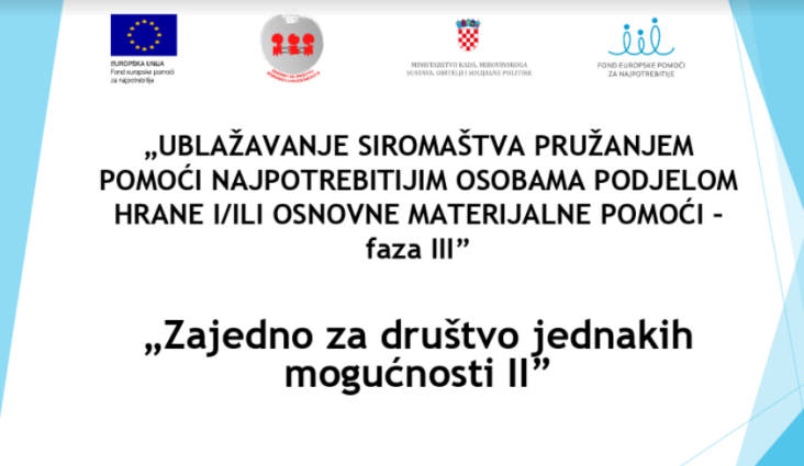 Hrvatski Crveni križ Gradsko Društvo Crvenog križa Našice partner je u projektu “Zajedno za društvo jednakih mogućnosti II“ kojeg je nositelj HCK GDCK Osijek iz EU programa FEAD „Ublažavanje siromaštva pružanjem pomoći najpotrebitijim osobama podjelom hrane i/ili osnovne materijalne pomoći – faza III“.