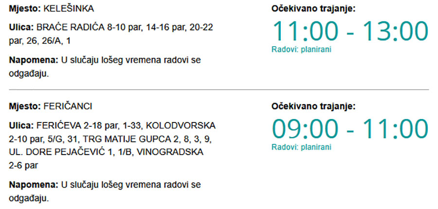 Danas bez struje u Feričancima i Kelešinki Piše: Siniša Kulišić11. veljače 2026.10. veljače 2026. Kako upozoravaju iz HEP-a, zbog radova na električnoj mreži danas (srijeda, 11. 2. 2026.) će predvidivo od 09:00 pa do 13:00 sati biti prekida u isporuci električne energije.