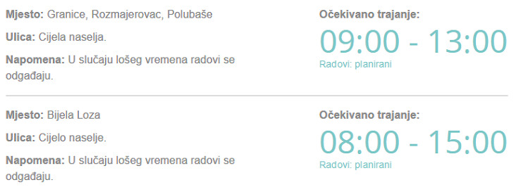 Danas bez struje u Granicama, Rozmajerovcu, Polubašama i Bijeloj Lozi Piše: Siniša Kulišić2. rujna 2021.2. rujna 2021. Kako upozoravaju iz HEP-a, zbog radova na električnoj mreži danas (četvrtak, 02. 09. 2021.) će predvidivo od 08:00 pa do 15:00 sati biti prekida u isporuci električne energije.