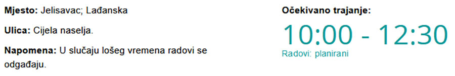 Danas bez struje u Jelisavcu i Lađanskoj Piše: Siniša Kulišić7. lipnja 2021. Kako upozoravaju iz HEP-a, zbog radova na električnoj mreži danas (ponedjeljak, 07. 06. 2021.) će predvidivo od 10:00 pa do 12:30 sati biti prekida u isporuci električne energije.