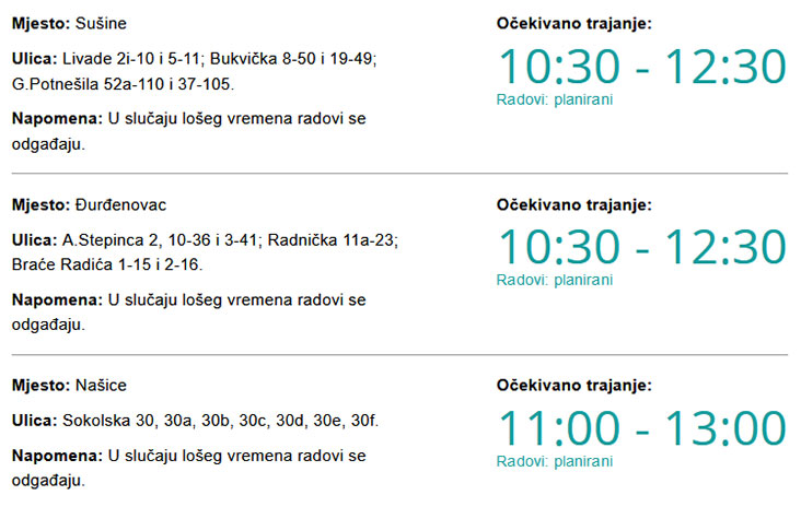 Danas bez struje u Našicama, Đurđenovcu i Sušinama Piše: Siniša Kulišić25. svibnja 2021. Kako upozoravaju iz HEP-a, zbog radova na električnoj mreži danas (utorak, 25. 05. 2021.) će predvidivo od 10:30 pa do 1:00 sati biti prekida u isporuci električne energije.