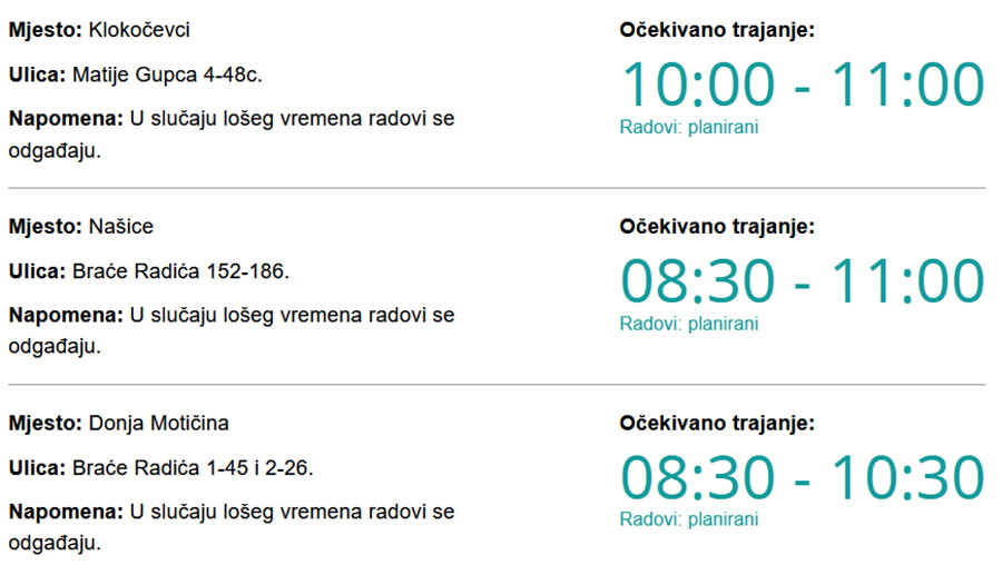 Danas bez struje u Našicama, Klokočevcima i Donjoj Motičini Piše: Siniša Kulišić21. rujna 2022.20. rujna 2022. Kako upozoravaju iz HEP-a, zbog radova na električnoj mreži danas (srijeda, 21. 09. 2022.) će predvidivo od 08:30 pa do 11:00 sati biti prekida u isporuci električne energije.