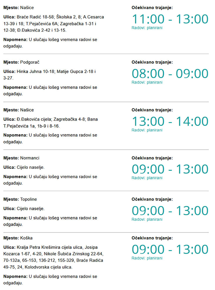 Danas bez struje u Našicama, Podgoraču, Koški i okolnim naseljima Piše: Siniša Kulišić3. rujna 2021.2. rujna 2021. Kako upozoravaju iz HEP-a, zbog radova na električnoj mreži danas (petak, 03. 09. 2021.) će predvidivo od 08:00 pa do 14:00 sati biti prekida u isporuci električne energije.