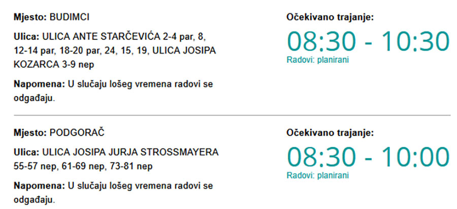 Danas bez struje u Podgoraču i Budimcima Piše: Siniša Kulišić20. travnja 2026.19. travnja 2026. Kako upozoravaju iz HEP-a, zbog radova na električnoj mreži danas (ponedjeljak, 20. 4. 2026.) će predvidivo od 08:30 pa do 10:30 sati biti prekida u isporuci električne energije.