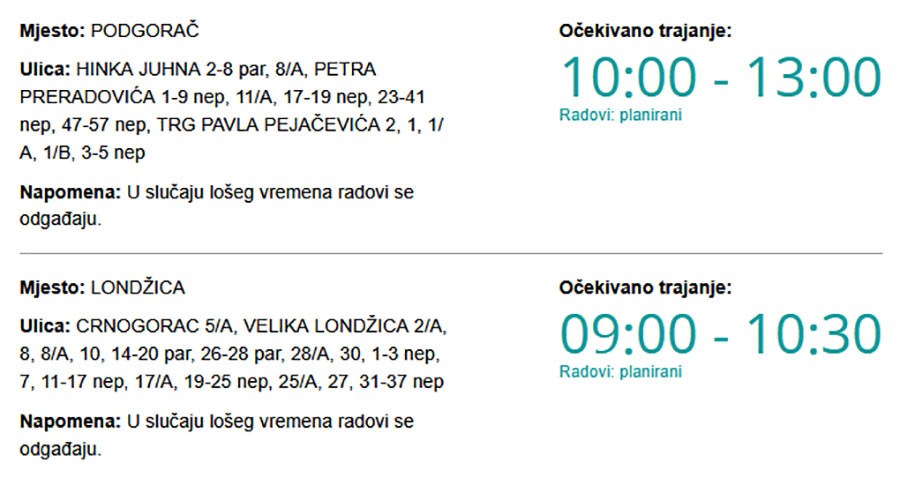 Danas bez struje u Podgoraču i Londžici Piše: Siniša Kulišić19. ožujka 2026.18. ožujka 2026. Kako upozoravaju iz HEP-a, zbog radova na električnoj mreži danas (četvrtak, 19. 3. 2026.) će predvidivo od 09:00 pa do 13:00 sati biti prekida u isporuci električne energije.