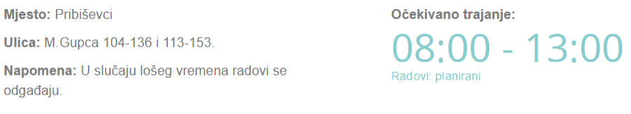 Danas bez struje u Pribiševcima Piše: Siniša Kulišić23. veljače 2022.23. veljače 2022. Kako upozoravaju iz HEP-a, zbog radova na električnoj mreži danas (srijeda, 23. 02. 2022.) će predvidivo od 08:00 pa do 13:00 sati biti prekida u isporuci električne energije.