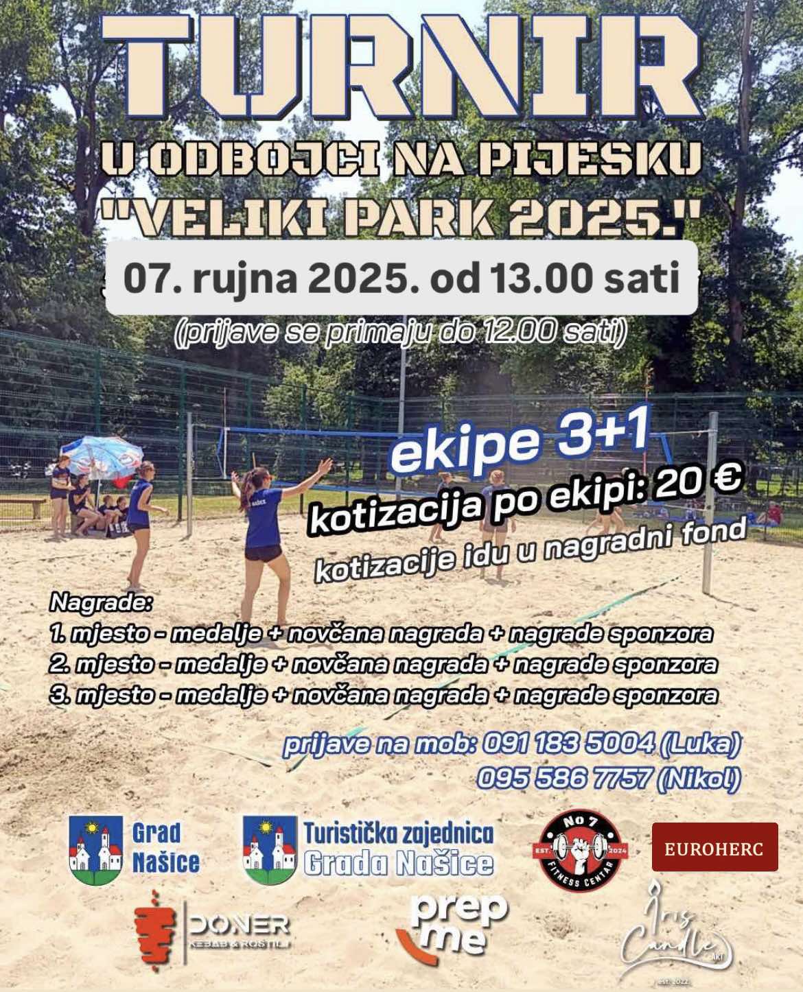 Danas, 7. rujna 2025. godine, u Našicama će se održati turnir u odbojci na pijesku „Veliki park 2025.“. Turnir započinje u 13:00 sati na terenu u Velikom parku, a prijave ekipa primaju se do 12:00 sati na dan natjecanja. Natjecat će se ekipe u formatu 3+1, a kotizacija po ekipi iznosi 20 eura. Kotizacije se u cijelosti uplaćuju u nagradni fond, iz kojeg će se osigurati nagrade za najbolje. Za prva tri mjesta predviđene su medalje, novčane nagrade te pokloni sponzora. Za sve dodatne informacije i prijave organizatori su dostupni na brojeve mobitela: 091 183 5004 (Luka) i 095 586 7757 (Nikol). Turnir organiziraju Grad Našice, Turistička zajednica Grada Našica i partneri, a posjetitelje očekuje uzbudljiv sportski dan u srcu grada.