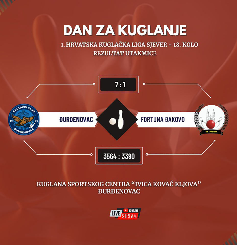 U subotu, 21. veljače 2026. godine, kuglači Đurđenovca odigrali su jednu od najboljih utakmica sezone i na domaćim stazama svladali ekipu Fortune iz Đakova rezultatom 7:1. Susret su otvorili Nedjeljko Jeličić i Davor Rončević pobjedama nad Darkom Živićem i Hrvojem Živkovićem, čime su domaćinu osigurali početnu prednost od 115 čunjeva. U drugom bloku nastupili su Ivan Pušić i Alen Šiler koji su, nakon nešto slabijeg ulaska u meč, podigli razinu igre i slavili protiv Zlatka Ercega i Igora Jukića.