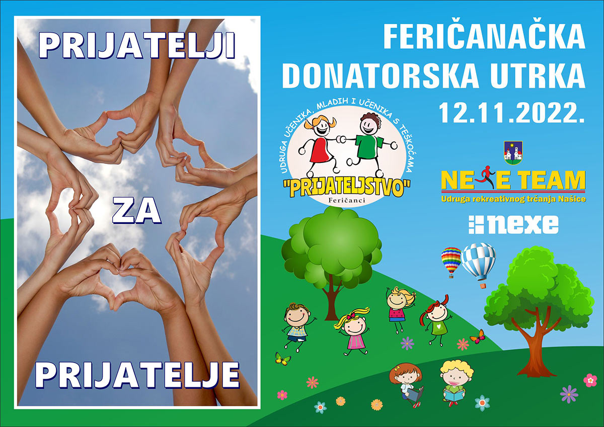 “Prijatelji za prijatelje” je feričanačka donatorska utrka rekreativnog karaktera koju organiziraju Udruga učenika, mladih i učenika s teškoćama “Prijateljstvo” – Feričanci i Udruga rekreativnog trčanja “Nexe Team” Našice, dana 12.11.2022. (subota) u Feričancima.