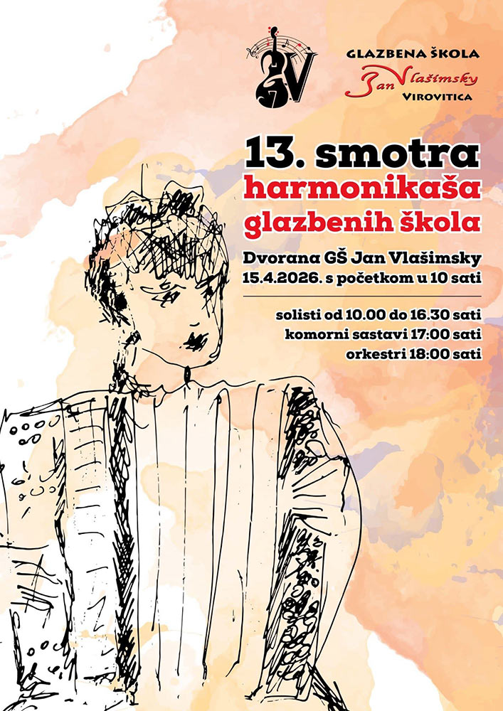 U Glazbenoj školi Jan Vlašimsky u Virovitici u srijedu, 15. travnja 2026. godine, održana je 13. smotra harmonikaša glazbenih škola. Glazbenu školu Kontesa Dora Našice na smotri je predstavljao učenik 6. razreda Gabriel Misbrener, uz pratnju svog učitelja Novice Todića. Na ovom glazbenom susretu nastupilo je više od 100 mladih harmonikaša iz cijele Hrvatske. Iz Glazbene škole Kontesa Dora zahvalili su domaćinima iz Virovitice na pozivu, a Gabrielu Misbreneru čestitali na vrlo uspješnom nastupu.