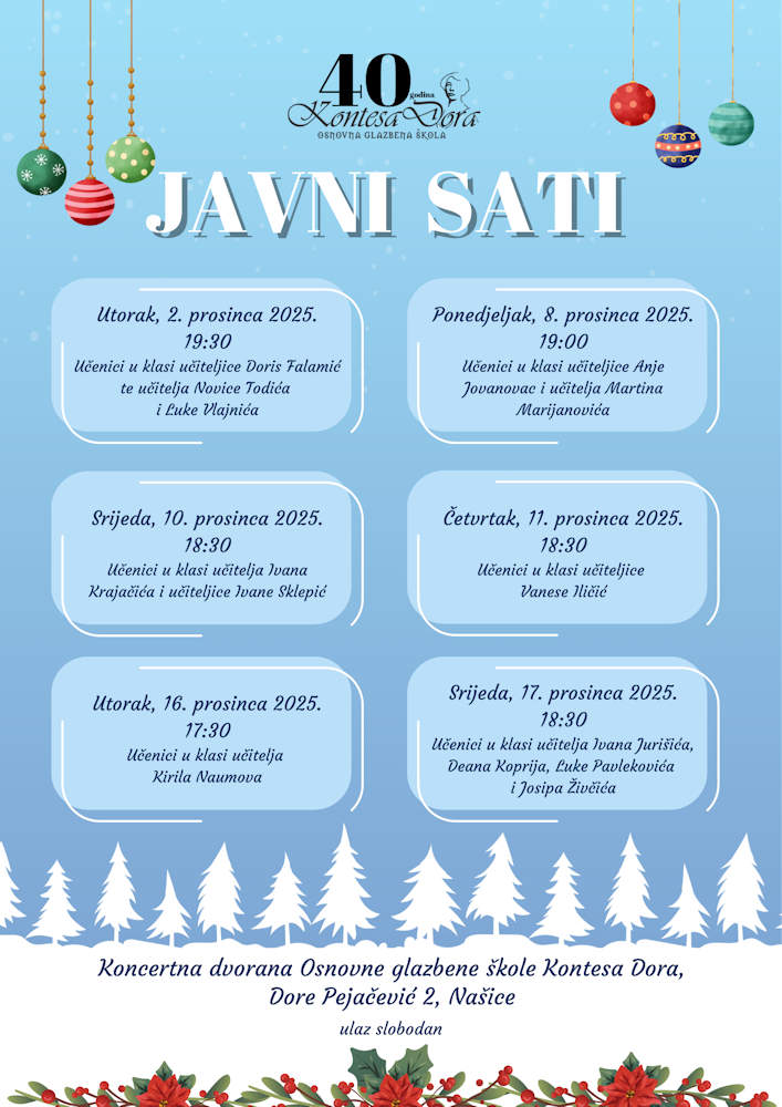 Učenici i učitelji Osnovne glazbene škole Kontesa Dora Našice i ovog prosinca održat će niz javnih sati u koncertnoj dvorani škole, na adresi Dore Pejačević 2.