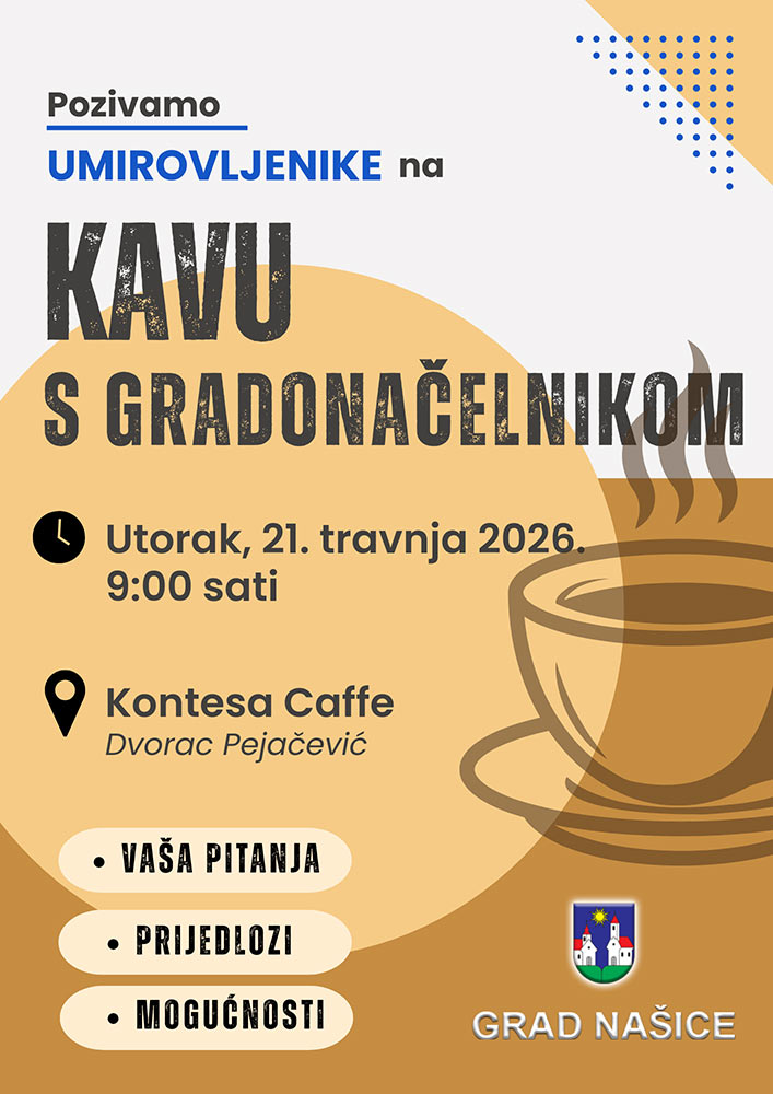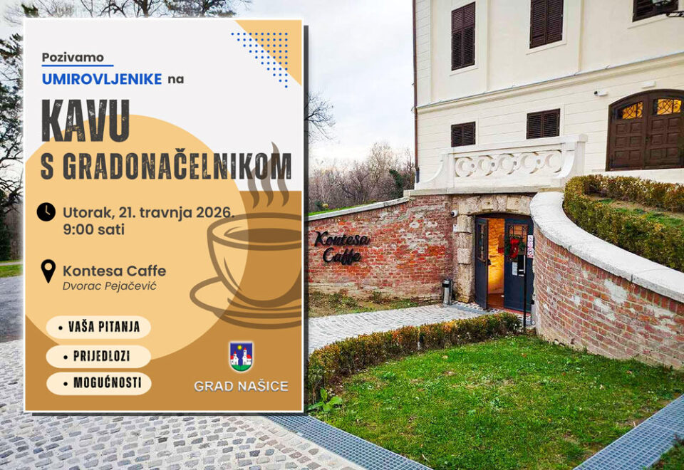 Grad Našice i ovoga puta poziva umirovljenike na tradicionalno druženje „Kava s gradonačelnikom”, koje će se održati u utorak, 21. travnja 2026. godine, s početkom u 9 sati u Kontesa Caffeu u Dvorcu Pejačević. Uz kavu i prigodnu zakusku, umirovljenici će imati priliku u neposrednom razgovoru s gradonačelnikom Krešimirom Kašubom iznijeti svoja razmišljanja, potrebe i prijedloge, ali i doznati više o aktualnim gradskim projektima i mogućnostima koje Grad Našice nudi osobama starije životne dobi. Poseban naglasak ovoga susreta bit će na Centru za starije osobe, koji se nalazi u završnoj fazi izgradnje, a tema je to koja zasigurno zanima velik broj naših sugrađana treće životne dobi.