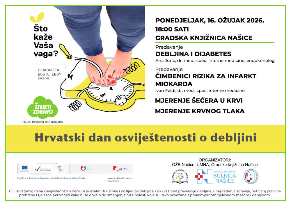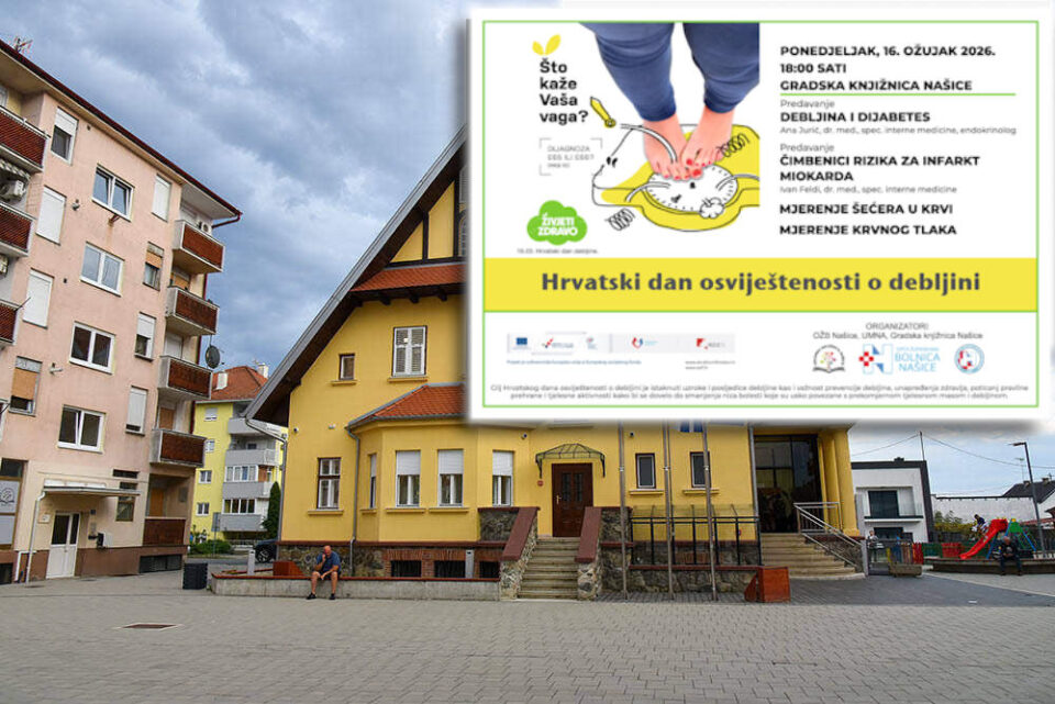 U povodu Hrvatskog dana osviještenosti o debljini, u Gradskoj knjižnici Našice danas, 16. ožujka 2026. godine, s početkom u 18 sati bit će održano javno predavanje i zdravstveno-edukativni program posvećen prevenciji debljine i bolestima koje su s njom povezane. Program će obuhvatiti dva stručna predavanja. O temi „Debljina i dijabetes” govorit će Ana Jurić, dr. med., specijalistica interne medicine i endokrinologije, dok će predavanje „Čimbenici rizika za infarkt miokarda” održati Ivan Feldi, dr. med., specijalist interne medicine. Uz predavanja, posjetiteljima će biti omogućeno i mjerenje šećera u krvi te mjerenje krvnog tlaka. Cilj obilježavanja Hrvatskog dana osviještenosti o debljini je skrenuti pozornost na uzroke i posljedice debljine te naglasiti važnost prevencije, unaprjeđenja zdravlja, pravilne prehrane i tjelesne aktivnosti. Organizatori programa su OŽB Našice, UMNA i Gradska knjižnica Našice.