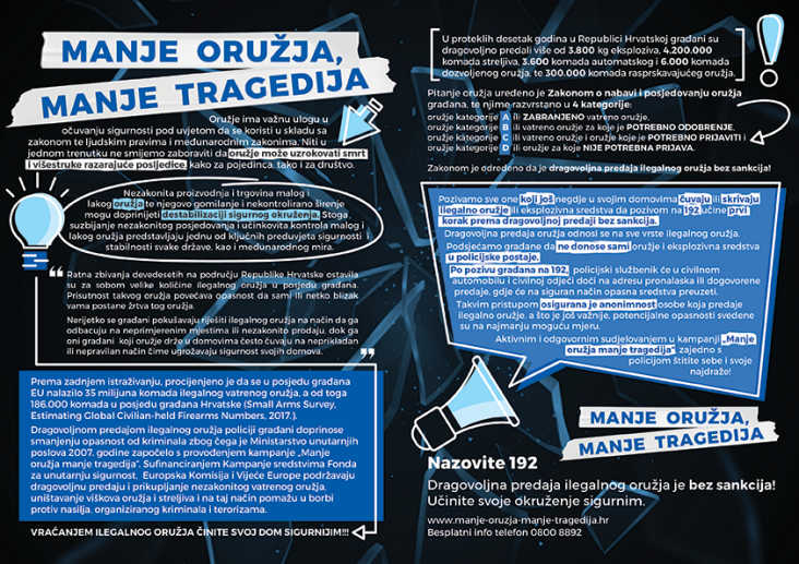Policija poziva građane, koji još u svojim domovima čuvaju ili skrivaju oružje ili eksplozivna sredstva, da ga bez straha od sankcija prijave policiji. Također, policija vas moli da takva sredstva ne donosite u policijske postaje, kako ne bi došlo do njihovog aktiviranja. O namjeri predaje obavijestite ih na broj 192 ili osobno u najbližoj policijskoj postaji. Oni će poslati stručne i osposobljene policijske službenike u civilu, koji će opasna sredstva preuzeti na siguran način. Dragovoljna predaja oružja vremenski je neograničena, a o svemu se dodatno možete informirati i putem besplatne telefonske linije 0800 88 92.