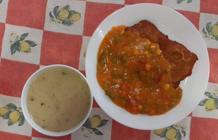 Juha, bečki odrezak, sotirani meksički mix