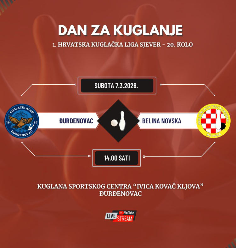 Kuglački klub Đurđenovac ovog će vikenda imati dvostruki natjecateljski izazov. Danas, 7. ožujka, na domaćoj kuglani odigrat će prvenstvenu utakmicu 20. kola, dok će u nedjelju klupski predstavnici nastupiti na Državnom prvenstvu parova u Ozlju. Prvi je na rasporedu domaći prvenstveni susret u kojem će Đurđenovčani od 14 sati ugostiti Belinu – Novsku, trenutačno posljednjeplasiranu momčad na ljestvici. Bit će to nova prilika za osvajanje važnih bodova pred domaćom publikom. Susret možete pratiti na službenom YouTube kanalu kluba, uz rezultat uživo t.ly/3b9-P