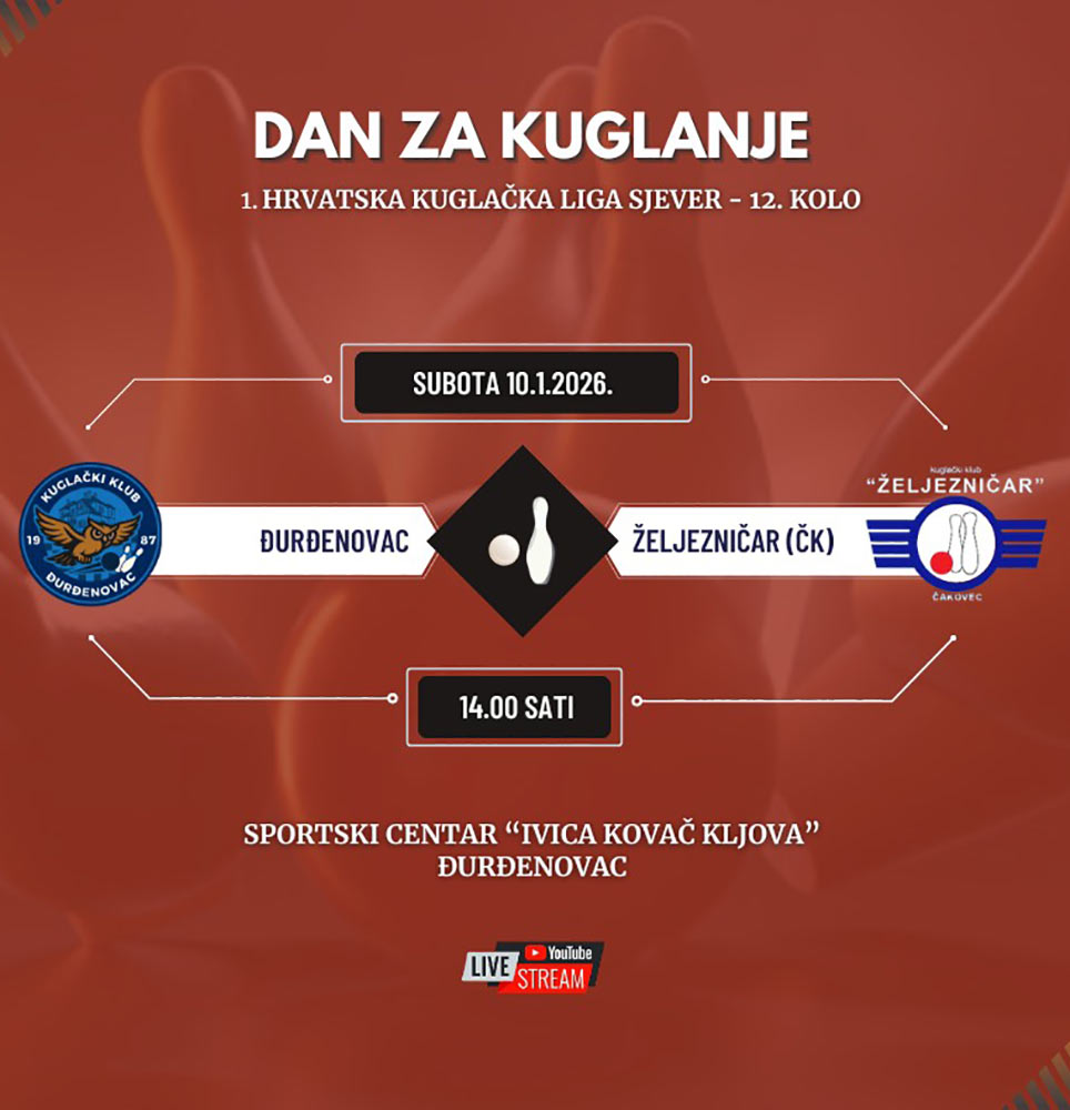 U 12. kolu prvenstva kuglači Kuglačkog kluba Đurđenovac sutra, 10. siječnja, od 14 sati na domaćoj kuglani dočekuju ekipu Željezničara iz Čakovca. Nakon prvog dijela sezone Đurđenovčani drže 2. mjesto na ljestvici, s dva boda prednosti upravo ispred Željezničara, koji se nalazi na 3. poziciji. U prvom međusobnom susretu, odigranom u Čakovcu, domaćini su slavili uvjerljivih 7:1. Sutra je prilika da Đurđenovac eventualnom pobjedom i novim bodovima poveća prednost nad izravnim konkurentom te potvrdi niz bez poraza koji traje još od prvog dijela sezone. Ipak, s obzirom na kvalitetu protivnika, očekuje se zahtjevna i neizvjesna utakmica. Atmosfera u klubu je dobra, a optimizam prisutan – uz nadu da će pred domaćom publikom doći i pozitivan rezultat. Za sve one koji neće do kuglane prijenos uživo moći će se pratiti na službenom YouTube kanalu kluba, a rezultat uz prijenos na stranici HKS-a: https://bit.ly/4ju6Jj4.