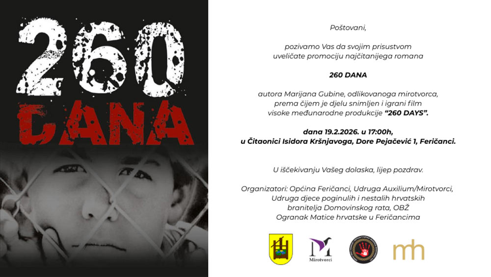 U Čitaonici Isidora Kršnjavoga u Feričancima sutra, 19. veljače 2026. godine, održat će se predstavljanje knjige „260 dana” autora Marijana Gubine. Početak programa predviđen je za 17 sati. U predstavljanju knjige sudjelovat će autor Marijan Gubina, ujedno predsjednik udruge Auxilium koja djeluje na području Hrvatske i inozemstva s ciljem izgradnje mreže međunarodnog mira. Uz autora, o djelu će govoriti Marko Marić, dopredsjednik Udruge djece poginulih i nestalih hrvatskih branitelja Domovinskog rata i predsjednik njezine osječke podružnice. Susret se održava u zajedničkoj organizaciji udruge Auxilium, Udruge djece poginulih i nestalih hrvatskih branitelja te Ogranka Matice hrvatske u Feričancima. Cijeli događaj odvija se pod pokroviteljstvom Općine Feričanci.