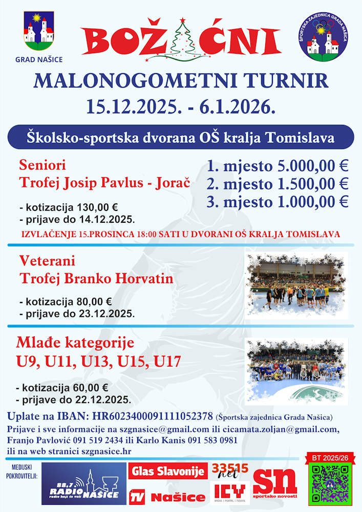 Turnir uključuje i utakmice mlađih kategorija U9, U11, U13, U15 i U17, uz kotizaciju od 60 eura, a prijave su otvorene do 22. prosinca. Kotizacije se uplaćuju na IBAN Športske zajednice Grada Našica, dok se prijave i dodatne informacije mogu dobiti putem e-pošte szgnasice@gmail.com ili na kontakt brojeve voditelja turnira. Ovogodišnje izdanje ponovno donosi velike nagrade i bogat sportski program koji svake zime okuplja brojne sportaše i gledatelje.