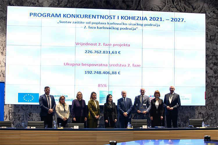 Svečana dodjela Ugovora o dodjeli bespovratnih sredstava za projekt „Sustav zaštite od poplava karlovačko-sisačkog područja, 2. faza – karlovačkog područja“ održana je u Nacionalnoj i sveučilišnoj knjižnici. Ugovor vrijedan 192,7 milijuna eura bespovratnih sredstava dodijeljen je Hrvatskim vodama u okviru Programa Konkurentnost i kohezija 2021. – 2027. Riječ je o nastavku jednog od najvećih infrastrukturnih projekata zaštite od poplava u Republici Hrvatskoj, ukupne vrijednosti gotovo 260 milijuna eura.