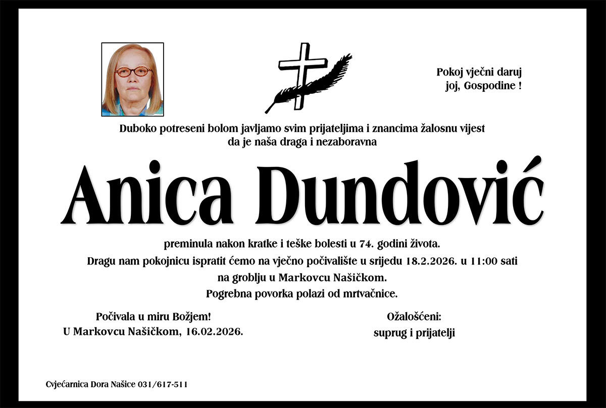 Ovim putem redakcija TV Našica obitelji i prijateljima iskazuje iskrenu sućut. Kako su ovo najteži trenuci za obitelj, TV Nasice.com ovakve objave NE NAPLAĆUJE i sve vezano za njih je BESPLATNO. Dovoljno je da nam se javite na službeni e-mail tvnasice@gmail.com te pošaljete smrtovnicu.