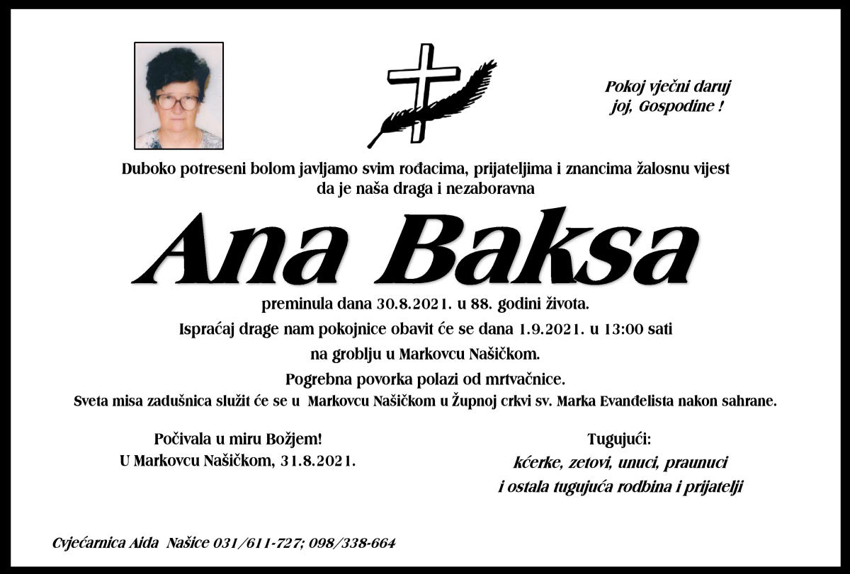 Kako su ovo najteži trenuci za obitelj, TV Nasice.com ovakve objave NE NAPLAĆUJE i sve vezano za njih je BESPLATNO. Dovoljno je da nam se javite na službeni e-mail tvnasice@gmail.com te pošaljete smrtovnicu.