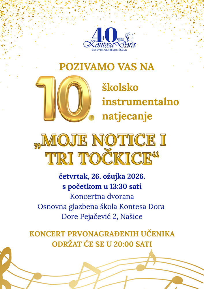 Koncertna dvorana Osnovne glazbene škole Kontesa Dora u Našicama ugostit će u četvrtak, 26. ožujka 2026. godine, natjecanje pod nazivom “Moje notice i tri točkice”. Ovogodišnje izdanje okupit će 44 učenika solista te deset mladih glazbenika u dva komorna tamburaška sastava.