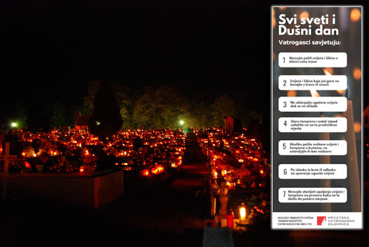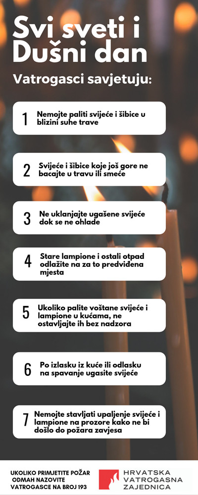 I ove će godine velik broj građana obilježiti blagdan Svih svetih i Dušni dan odlaskom na groblja, postavljanjem cvijeća na grobove i paljenjem svijeća. Na taj se način sjećamo naših najmilijih koji više nisu s nama. U ovakvim trenucima potrebno je pozvati građane na oprez zbog mogućeg nastanka požara jer se velika količina upaljenih svijeća, rastopljenog voska i suhog cvijeća na grobljima može lako zapaliti.