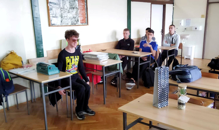Nakon uvodne riječi i pozdrava od strane predsjednice Tatjane Bela, učenik Borna održao je predavanje o osnovnom položaju brajice. Upoznao ih je sa tehnikom pisanja i razumijevanja tog pisma. Rekao je kako je on kao dječak od pet i pol godina počeo učiti ovo pismo, kako bi sa sedam godina u prvi razred došao pismen. Pisao je što su tražili a na kraju im je napisao rečenicu koju su morali odgonetnuti pomoću lente sa svim slovima brajice koju smo donijeli. Učenici su bili izuzetno zainteresirani te su pratili svaku riječ, a u zadatku su bili izuzetno uspješni. Nakon službenog dijela uslijedila je i mala zakuska, a razrednica, prof. Ljiljana Kasapović, na poklon je dobila samoodrživi vrt, koji rade članice Udruga Slijepih Našice.