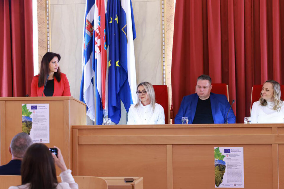 U Velikoj vijećnici Skupštine OBŽ, danas (8. travnja 2026. godine) je održana uvodna konferencija projekta „Primjena mikorize za održivu prilagodbu klimatskim promjenama u vinogradarstvu“, u kojem kao prijavitelj projekta sudjeluje Prehrambeno-tehnološki fakultet Osijek u partnerstvu s Osječko-baranjskom županijom. Županica Nataša Tramišak podržala je projekt i zahvalila se na inicijativi znanstvenicima koji, primjenjujući nove tehnologije i metode, rade na jačanju i razvoju vinogradarstva, s ciljem proizvodnje još kvalitetnijih vina i boljeg pozicioniranja Osječko-baranjske županije, kako na vinogradarskoj karti Hrvatske, tako i šire.