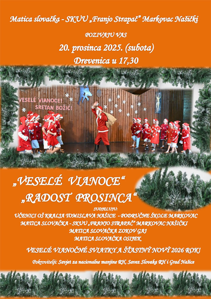 Matica slovačka i SKUU „Franjo Strapač“ Markovac Našički 20. prosinca 2025. godine priprema blagdanski program „Veselé Vianoce“ – „Radost prosinca“, koji će se održati u Drevenici s početkom u 17.30. Riječ je o prigodnom božićnom susretu ispunjenom glazbom, dječjim nastupima i tradicijskim sadržajima slovačke zajednice. U programu sudjeluju učenici OŠ kralja Tomislava Našice – Područne škole Markovac, SKUU „Franjo Strapač“ Markovac Našički, Matica slovačka Zokov Gaj i Matica slovačka Osijek. Svojim izvedbama unijet će blagdanski ugođaj i prikazati kako se njeguje kulturna baština i radost prosinca u slovačkoj tradiciji. Organizatori sve posjetitelje pozivaju na zajedničko druženje uoči blagdana uz želju za vesele božićne dane i sretnu novu 2026. godinu. Program se održava pod pokroviteljstvom Savjeta za nacionalne manjine RH, Saveza Slovaka RH i Grada Našica.