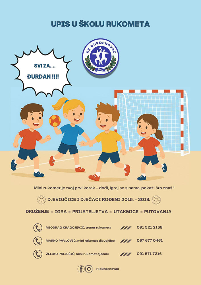 Svaka uspješna sportašica i sportaš započeli su svoju priču prvim korakom – a prvi korak u rukometu možeš napraviti upravo u školi rukometa Đurđenovac! Škola rukometa otvara svoja vrata svim djevojčicama i dječacima u dobi od 7 do 10 godina koji žele kroz igru i zabavu upoznati rukomet te uz podršku trenera i budućih prijatelja razviti ljubav prema ovom sportu.