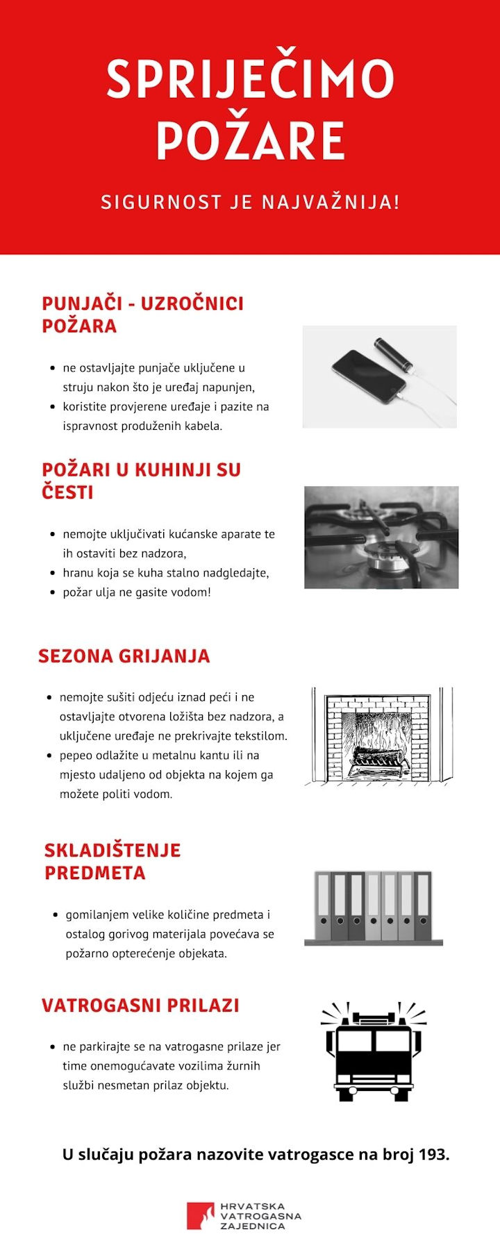 - ukoliko primijetite požar probajte ostati što smireniji, nazovite vatrogasce na broj 193 i dajte im što više podataka.
