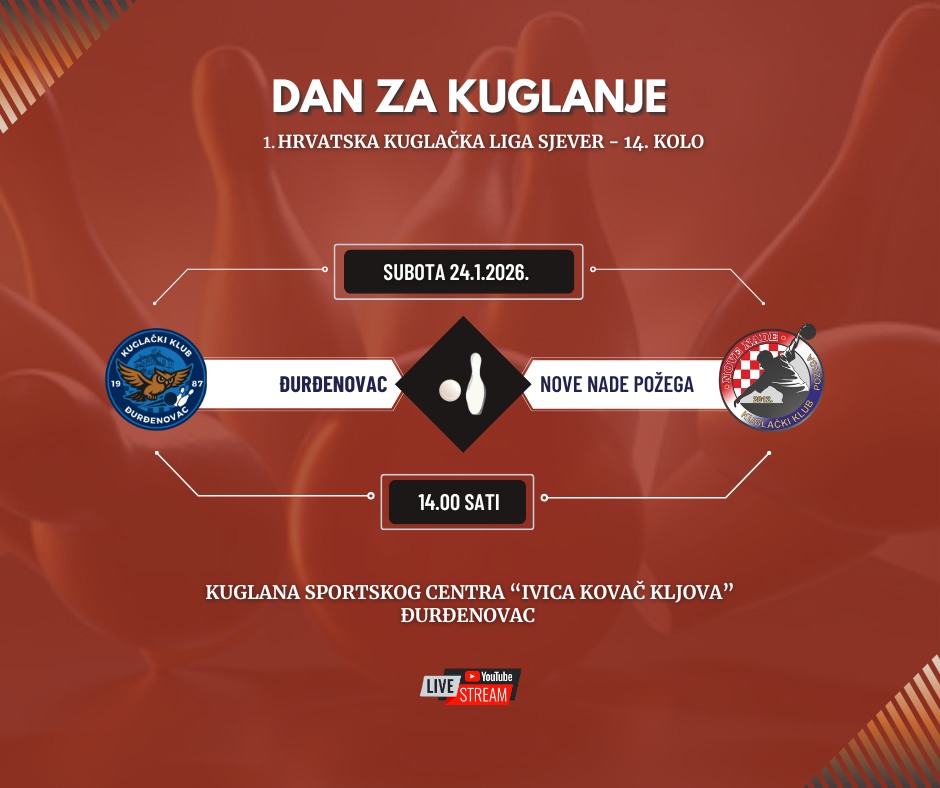 U klubu vjeruju kako će publika još jednom ispuniti kuglanu i biti važan vjetar u leđa svojim igračima. Sve upućuje na to da nas očekuje napeta i kvalitetna utakmica, kakva se u Đurđenovcu nije često viđala još od dana superligaških ogleda. Utakmica KK Đurđenovac – Nove nade Požega igra se u subotu, 24. siječnja, s početkom u 14 sati. Utakmica će se prenositi na službenom YouTube kanalu Kuglačkog kluba Đurđenovac, a rezultat uživo moći ćete pratiti na poveznici t.ly/G6hn2.