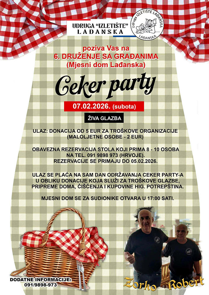 Udruga „Izletište” Lađanska organizira 6. druženje sa građanima – Ceker party, koje će se održati u subotu, 7. veljače 2026. godine, u Mjesnom domu. Druženje počinje u 17 sati, uz živu glazbu i opuštenu, domaću atmosferu kakva je ovoj manifestaciji zaštitni znak. Ulaz se plaća u obliku donacije – 5 eura za odrasle i 2 eura za maloljetne sudionike – a prikupljena sredstva koristit će se za troškove glazbe, pripremu i čišćenje doma te nabavu higijenskih potrepština. Obavezna je rezervacija stola koji prima od 8 do 10 osoba, a rezervacije se primaju do 5. veljače na broj 091/9898-973 (Hrvoje). Donacija se plaća na sam dan događanja. Organizatori pozivaju sve mještane i goste da se pridruže, donesu dobro raspoloženje i uživaju u još jednom zajedničkom druženju u Lađanskoj dok će se za glazbu pobrinuti Zorko i Robert.