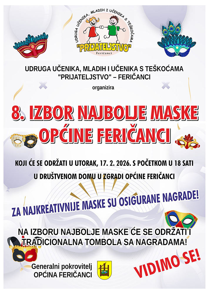 Udruga učenika, mladih i učenika s teškoćama „Prijateljstvo“ – Feričanci organizira tradicionalni, osmi po redu Izbor najbolje maske Općine Feričanci. Manifestacija će se održati sutra, 17. veljače 2026. godine, s početkom u 18 sati u prostoru Društvenog doma u zgradi Općine Feričanci. Organizatori su za ovogodišnje izdanje pripremili bogat program u kojem će fokus biti na kreativnosti i originalnosti sudionika. Za autore najkreativnijih maski osigurane su prigodne nagrade, a uz samu reviju maski bit će održana i tradicionalna tombola s nagradama za posjetitelje. Cilj ovog okupljanja je očuvanje pokladnih običaja te poticanje zajedništva i kreativnog izražavanja među mladima i ostalim mještanima. Generalni pokrovitelj događaja je Općina Feričanci, koja i ove godine podržava rad udruge „Prijateljstvo“ u organizaciji ove manifestacije.